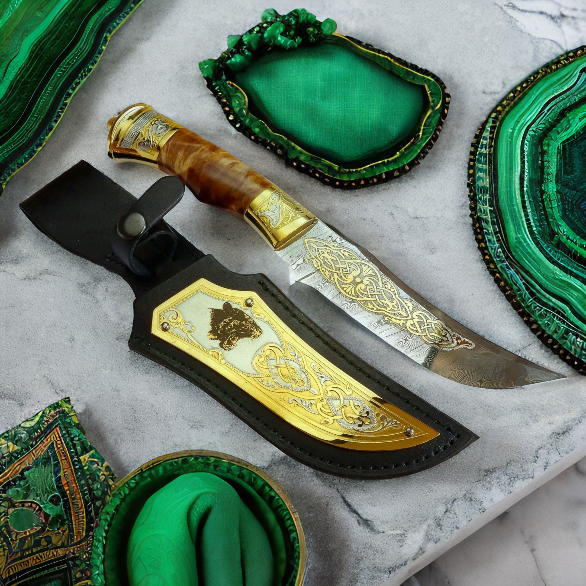 Нож №6 /дамаск/ - это изысканный подарок и уникальный коллекционный предмет. Благодаря ручной работе, каждый деталь этого ножа, от клинка из дамасской стали до инкрустированной рукояти, выполнена с высочайшим мастерством. Дамасская сталь известна своей уникальной текстурой и высокой прочностью, что делает этот нож не только красивым, но и практичным. Для удобства в комплект включены стильные ножны. |