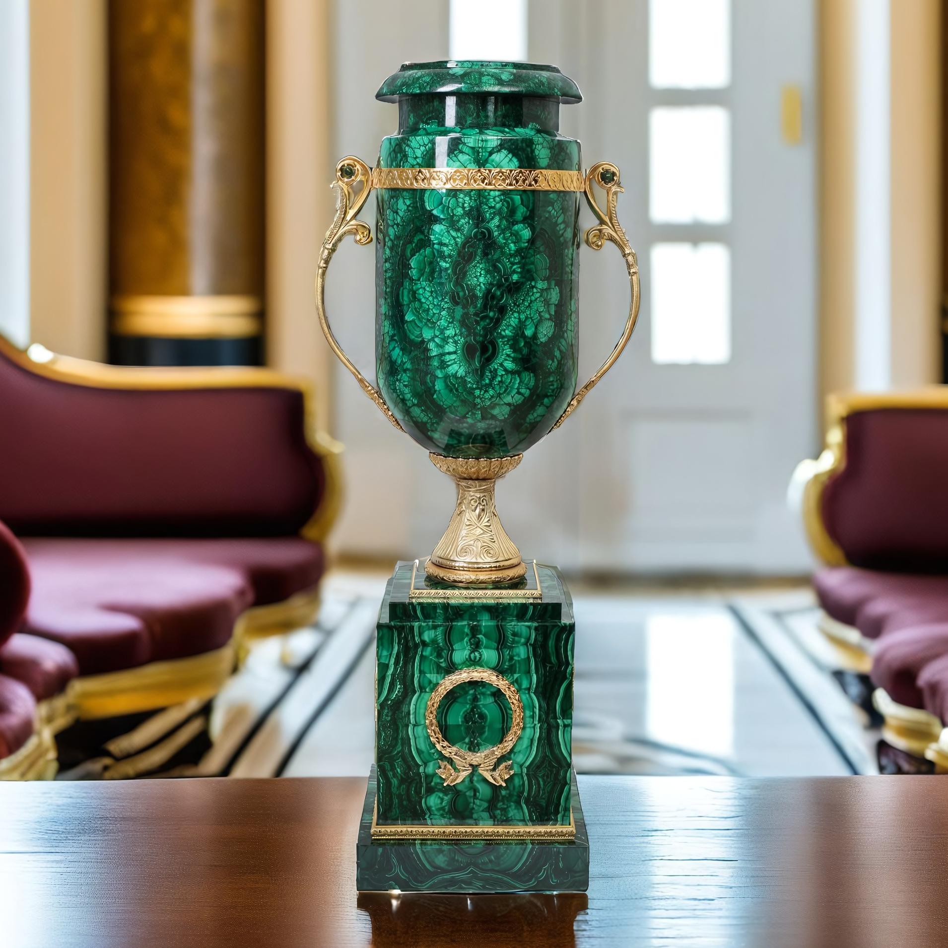 Специально для ценителей эксклюзивных предметов декора и искусства представляем роскошную вазу Аврора. Этот превосходный предмет изготовлен из самого качественного малахита и украшен элементами из позолоченной бронзы. Придающая помещению особенный шарм, ваза Аврора сделает ваш интерьер неотразимым. Малахит — материал, заслуживающий восхищения. Его узоры неповторимы, как отпечатки пальцев человека. Позолоченная бронза, добавляет изысканности и благородства.