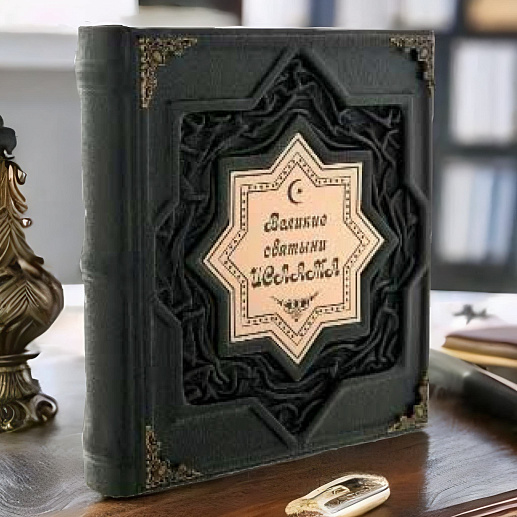 Очень красивая подарочная книга, выполненная нашим мастером в сдержанном, но в тоже время изысканном стиле. Все издание представляет собой настоящее произведение искусства, в середине красуется мусульманская символика, орнаменты подобраны исключительно верно, а золотая роспись изумительным образом дополняет натуральную телячью кожу зеленого цвета.