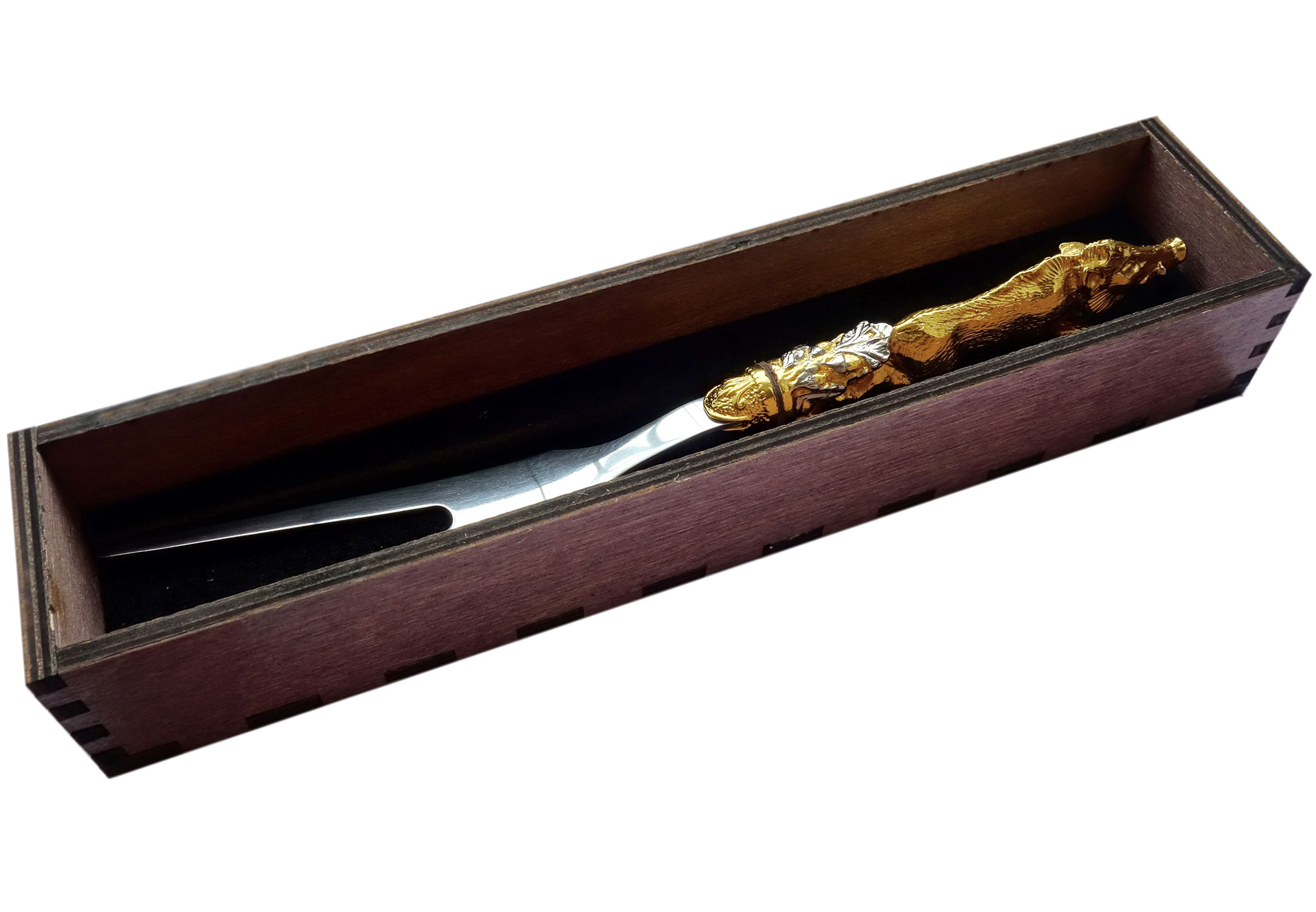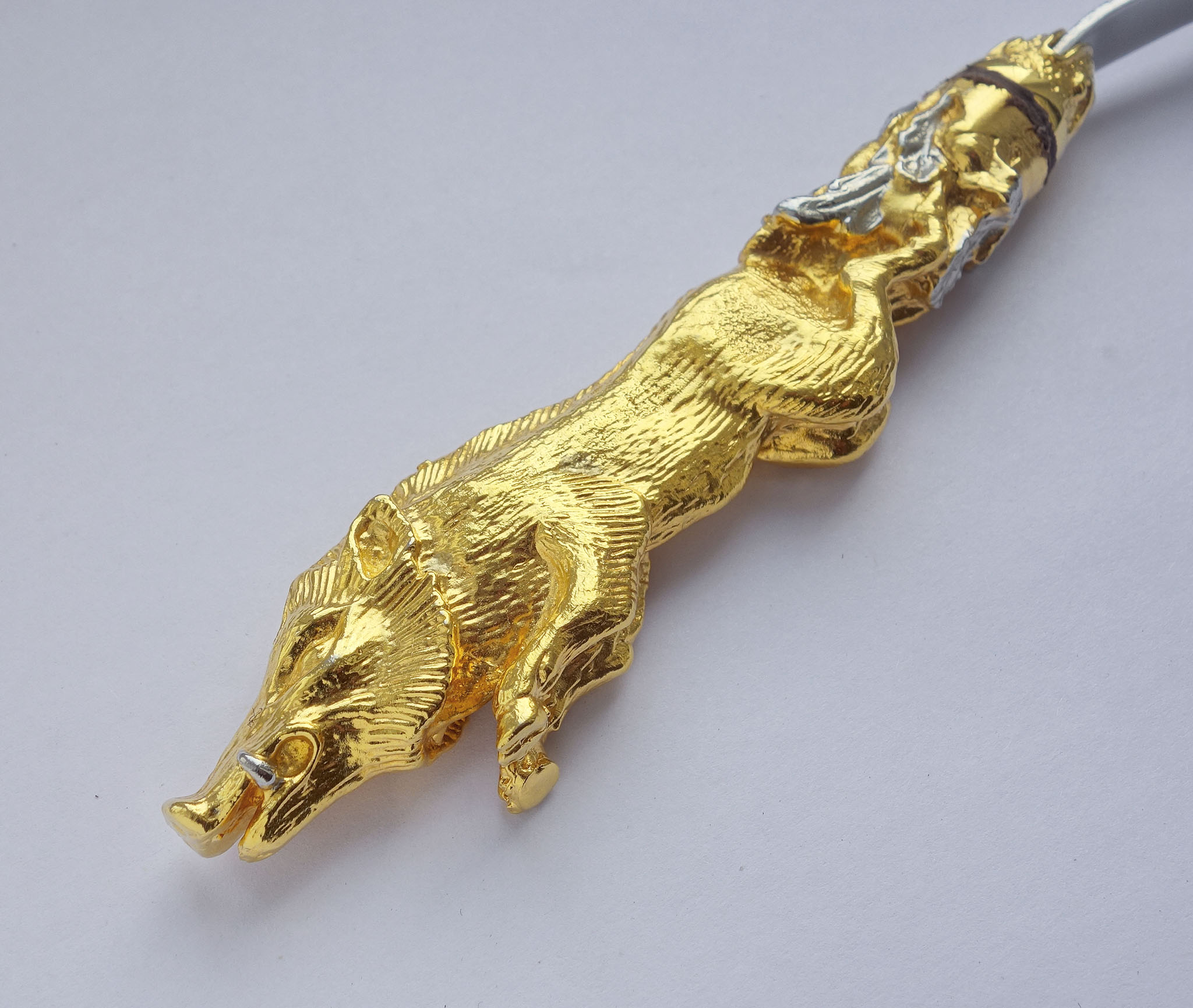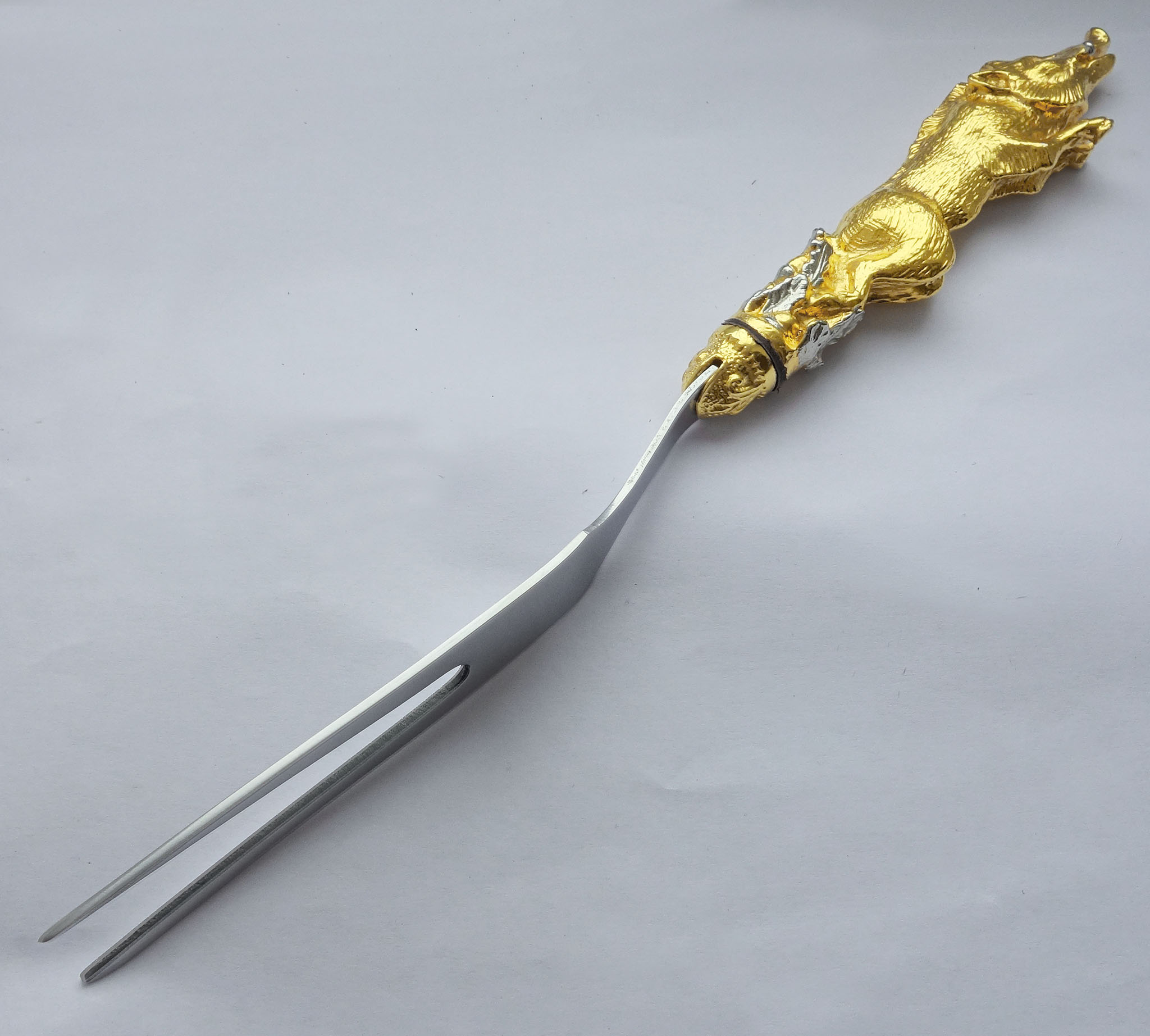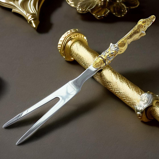 Представляем Вашему вниманию уникальный аксессуар для каждого гурмана — вилку для мяса Кабан. Этот изысканный предмет столового сервиза станет ярким дополнением к Вашему обеденному столу и добавит нотку эксклюзивности при употреблении любимых блюд. Вилка выполнена из качественного металла, а её рукоять — это произведение искусства. Она изготовлена из позолоченной бронзы и украшена фигуркой кабана. Такой аксессуар несомненно привлечёт внимание и вызовет восхищение у Ваших гостей. С вилкой для мяса Кабан каждый обед превратится в настоящий праздник! Не пропустите возможность добавить в свой столовый сервиз настоящую изюминку. Сделайте свой выбор в пользу вилки для мяса Кабан! |