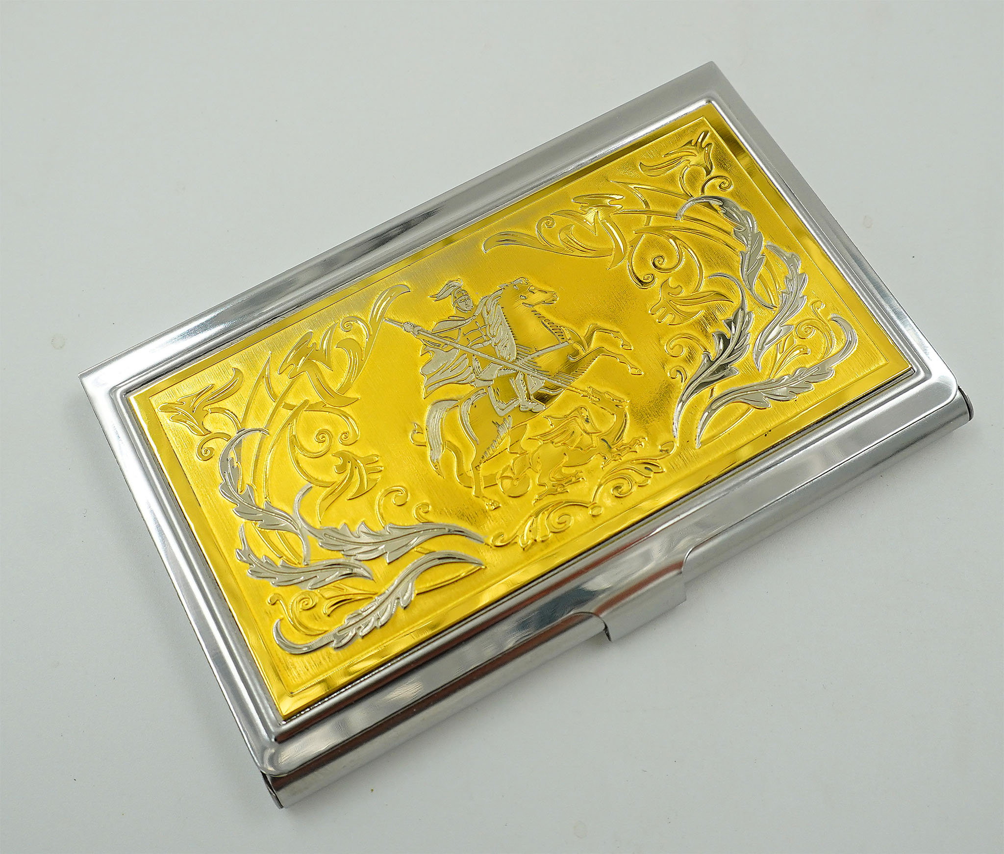 Эксклюзивная визитница "Георгий Победоносец" - это сочетание стиля и практичности. На лицевой стороне визитницы красиво выгравирован образ великого святого Георгия Победоносца. Визитница выполнена из прочного материала, который обеспечивает ей долгий срок службы. Компактный размер аксессуара позволяет всегда иметь при себе важные контакты. Этот изысканный аксессуар привлекает внимание своим оригинальным дизайном и высоким качеством исполнения, а также станет отличным подарком для любителей эксклюзивных и в то же время функциональных предметов. |