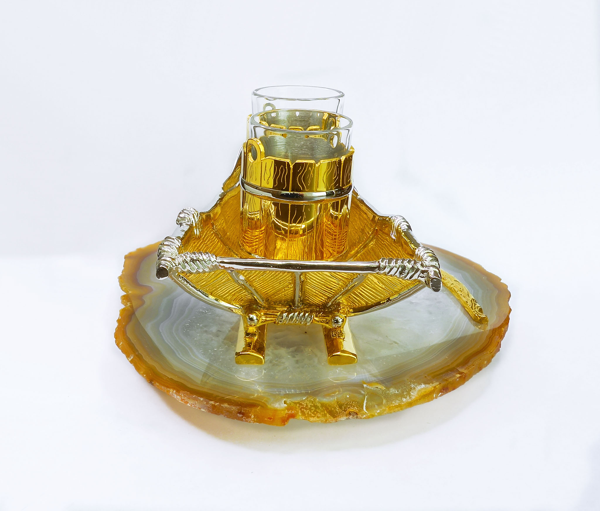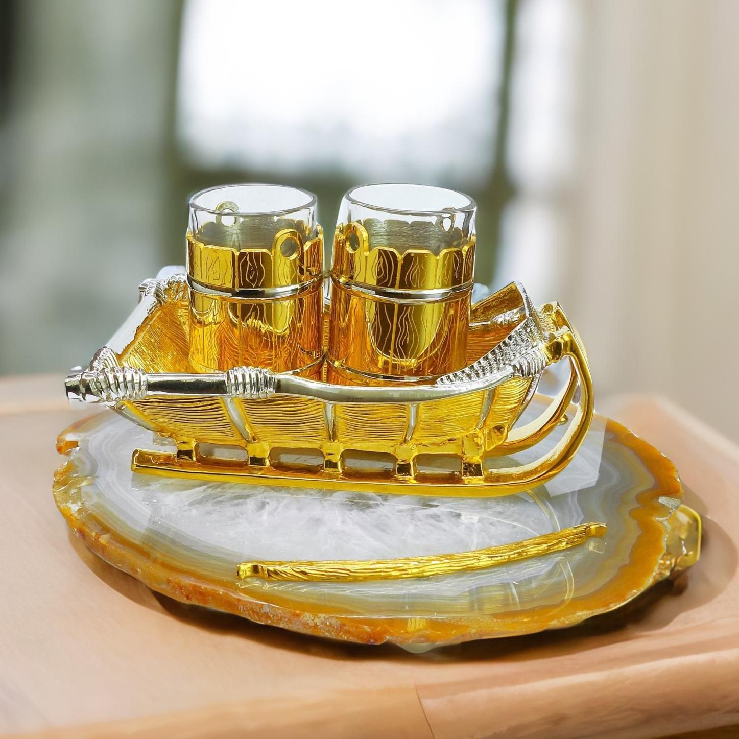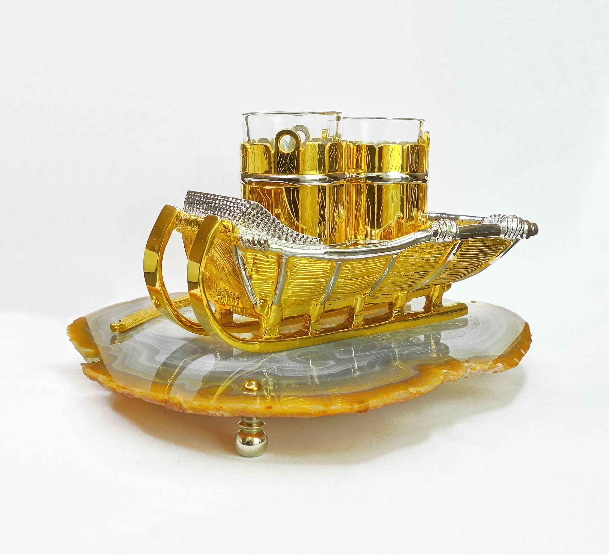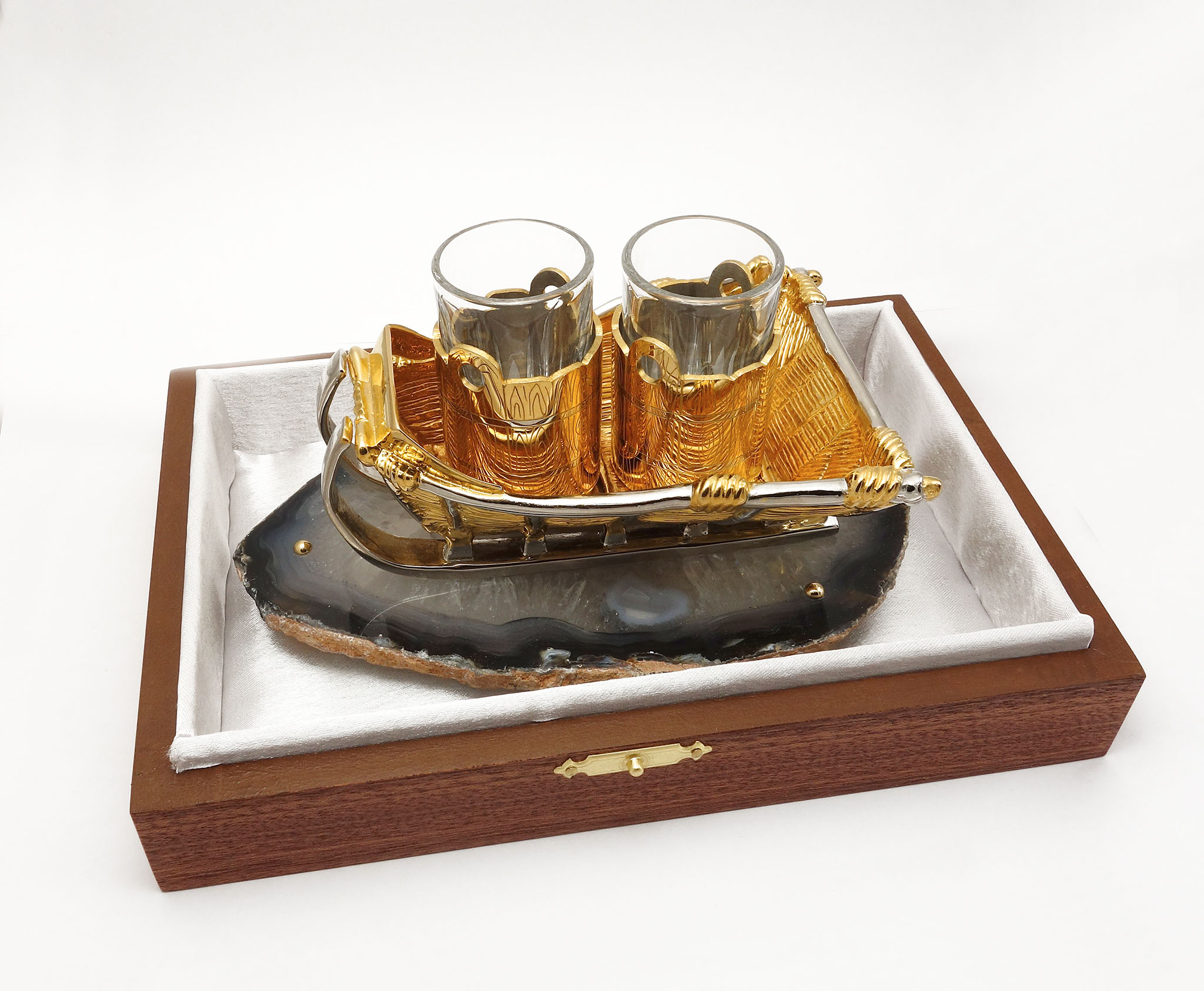 В этом наборе 2 рюмки в виде русских ведер, которые просто великолепно смотрятся на подставке из агата. Рюмки стоят на позолоченных санях из бронзы, словно готовые отправиться в зимний вечерний поход по снежным дорогам. Не упустите возможность приобрести такой великолепный подарок! |