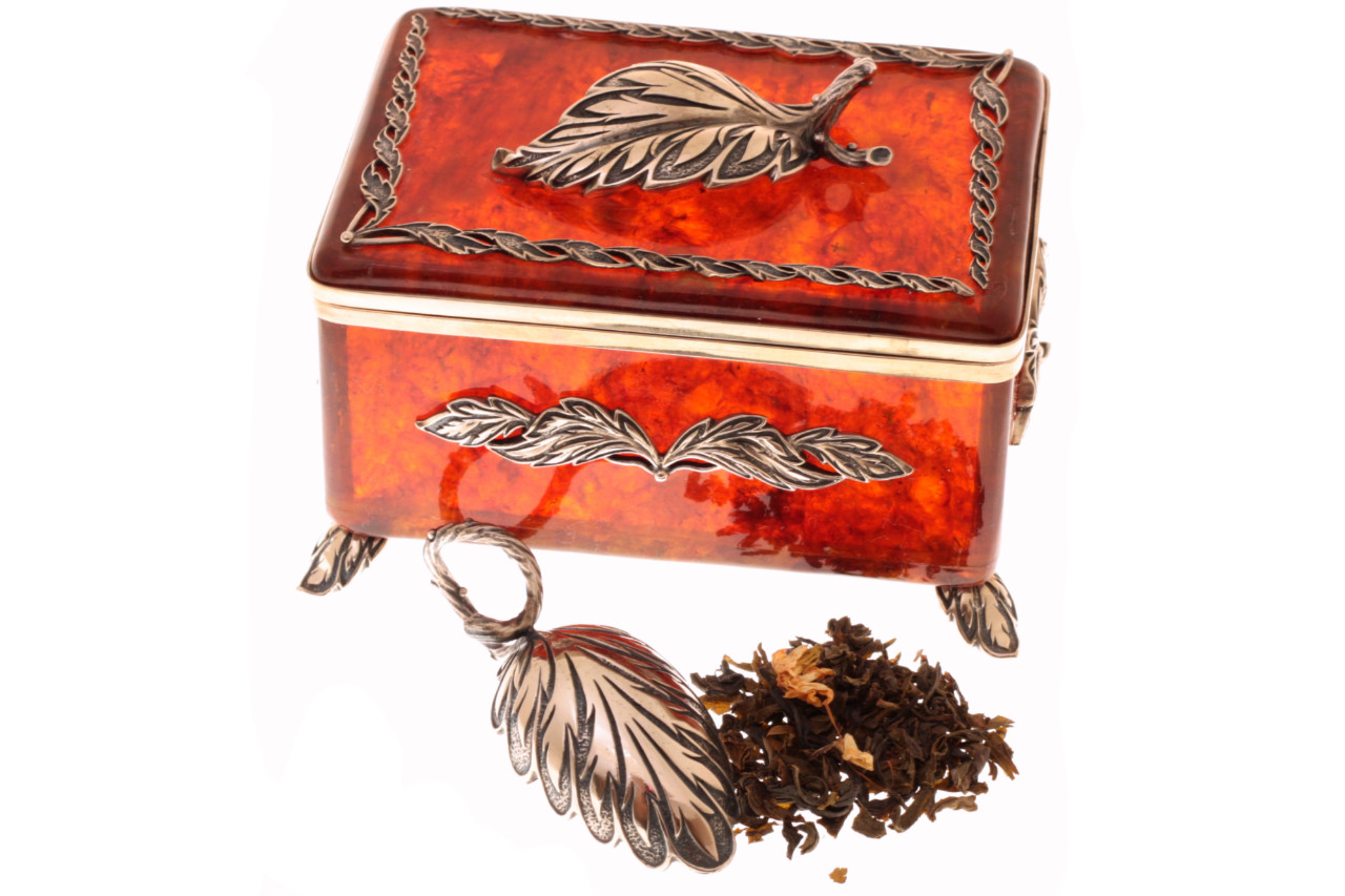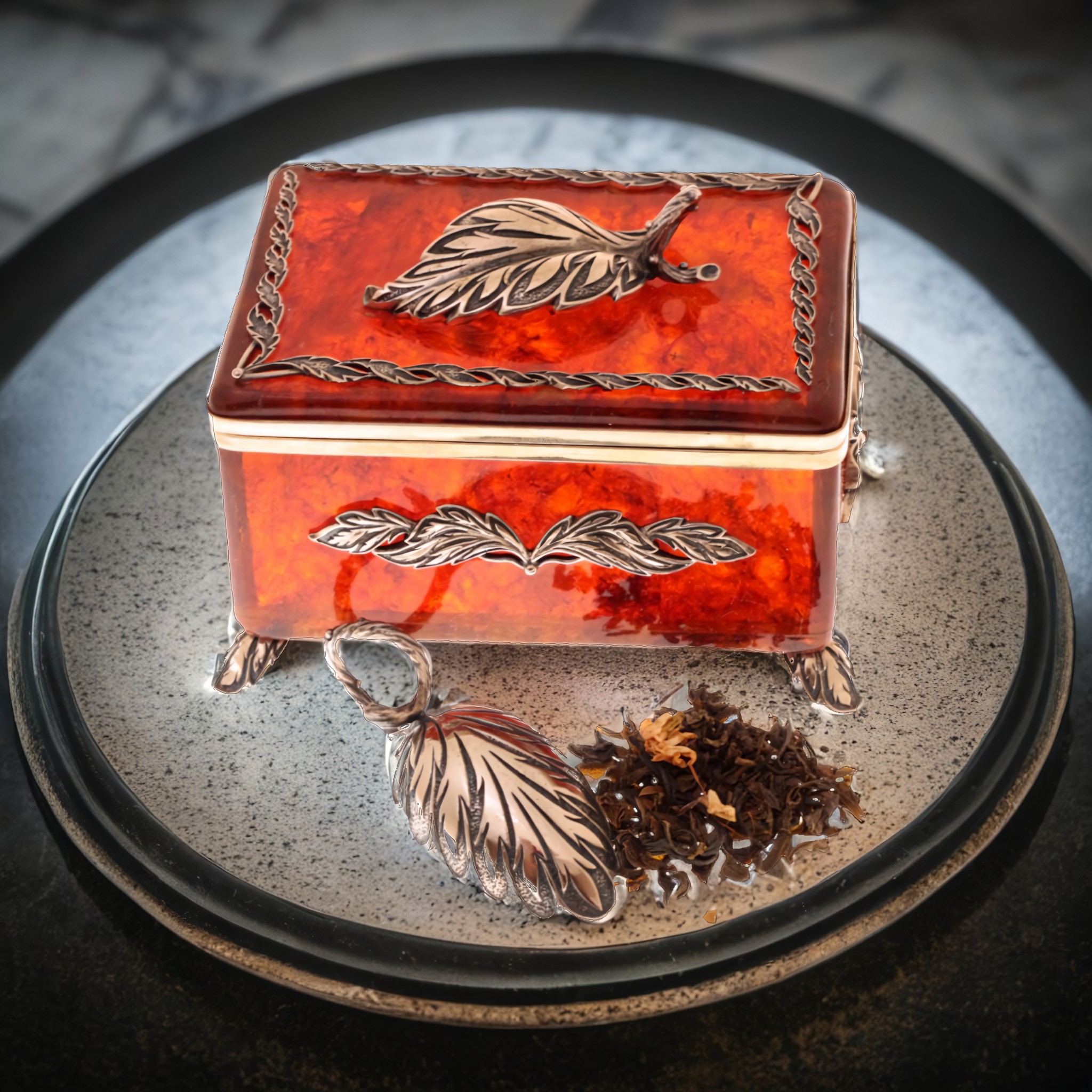 Приходите и откройте для себя нашу уникальную коробочку для чая с ложечкой из янтаря. Этот прекрасный предмет добавит красоты вашим утренним и вечерним ритуалам чаепития, а также послужит отличным подарком для семьи и друзей. Украшенная строгими и при этом изящными бронзовыми элементами в виде чайного листа — она потрясет вас своей красотой.